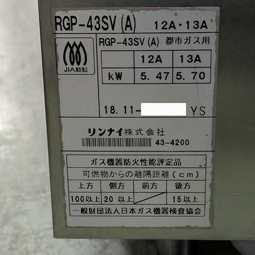 他の画像を見る 直接引取の場合は送料追加なし【大宮店】 【業界最長1年保証】【中古】上火式焼物器 リンナイ(Rinnai) RGP-43SV 幅613×奥行425×高さ602 都市ガス 【送料別途見積】【業務用】【大宮店在庫】 販売価格 ¥ 85,800 税込