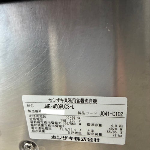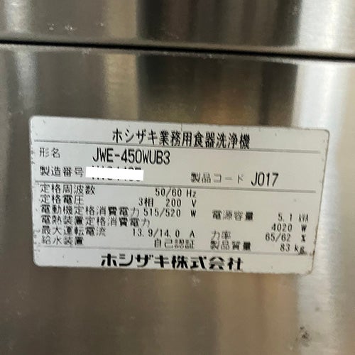 他の画像を見る 直接引取の場合は送料追加なし【金沢厨房館】 【業界最長1年保証】【中古】食器洗浄機 スルータイプ ホシザキ JWE-450WUB3 幅600×奥行650×高さ1350 三相200V 【送料別途見積】【業務用】【金沢厨房館在庫】 定価 ¥ 1,444,300 (税込)のところ 販売価格 ¥ 349,000 税込