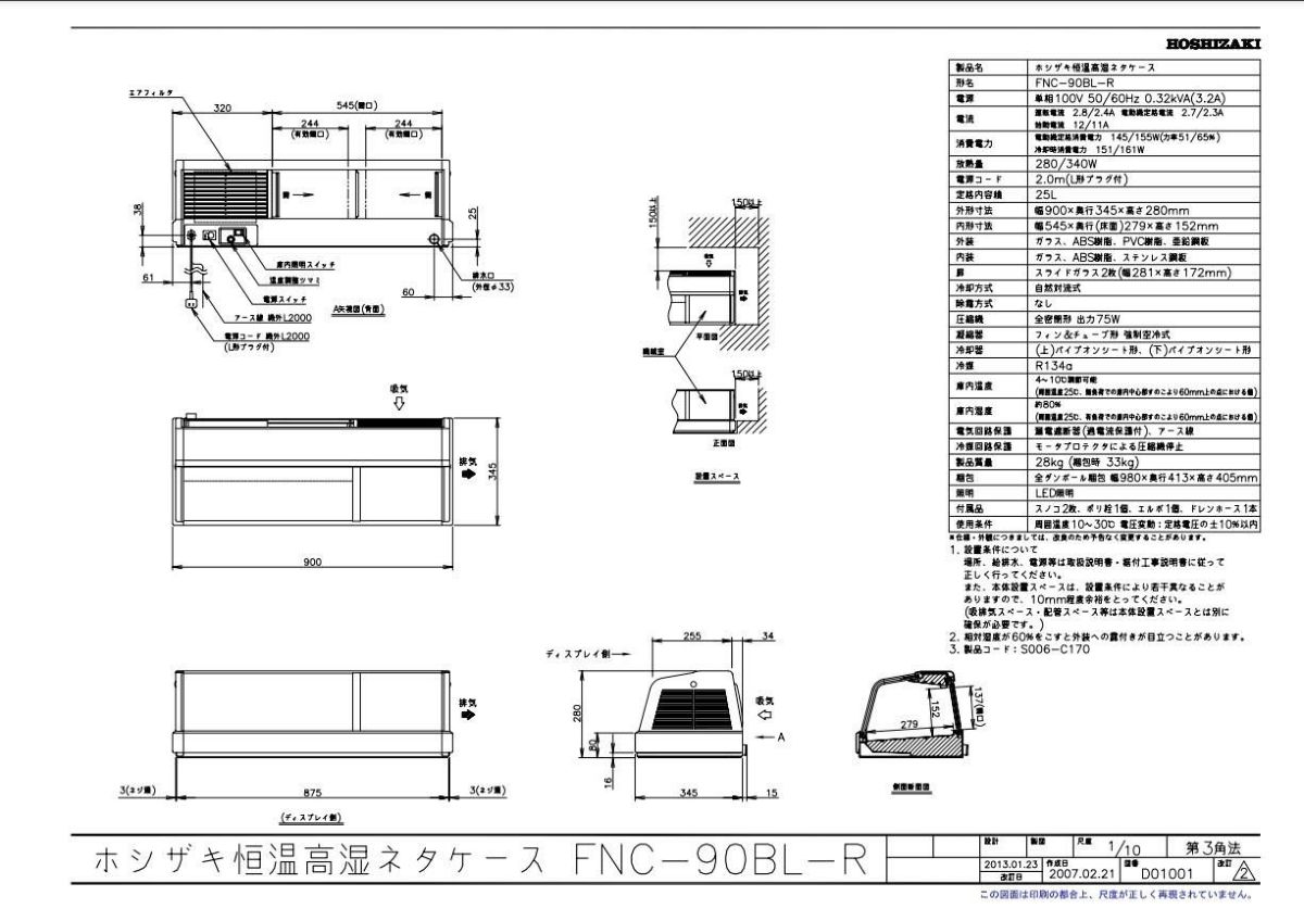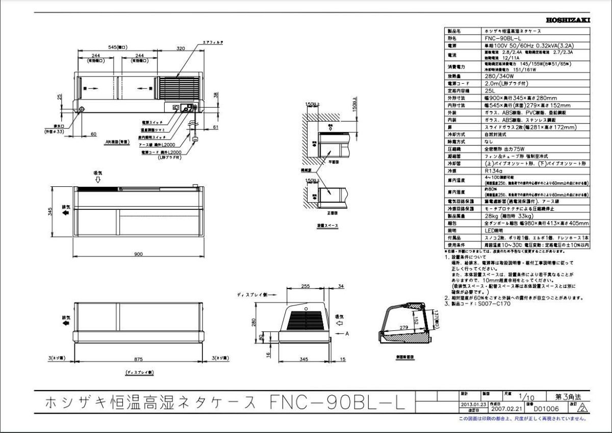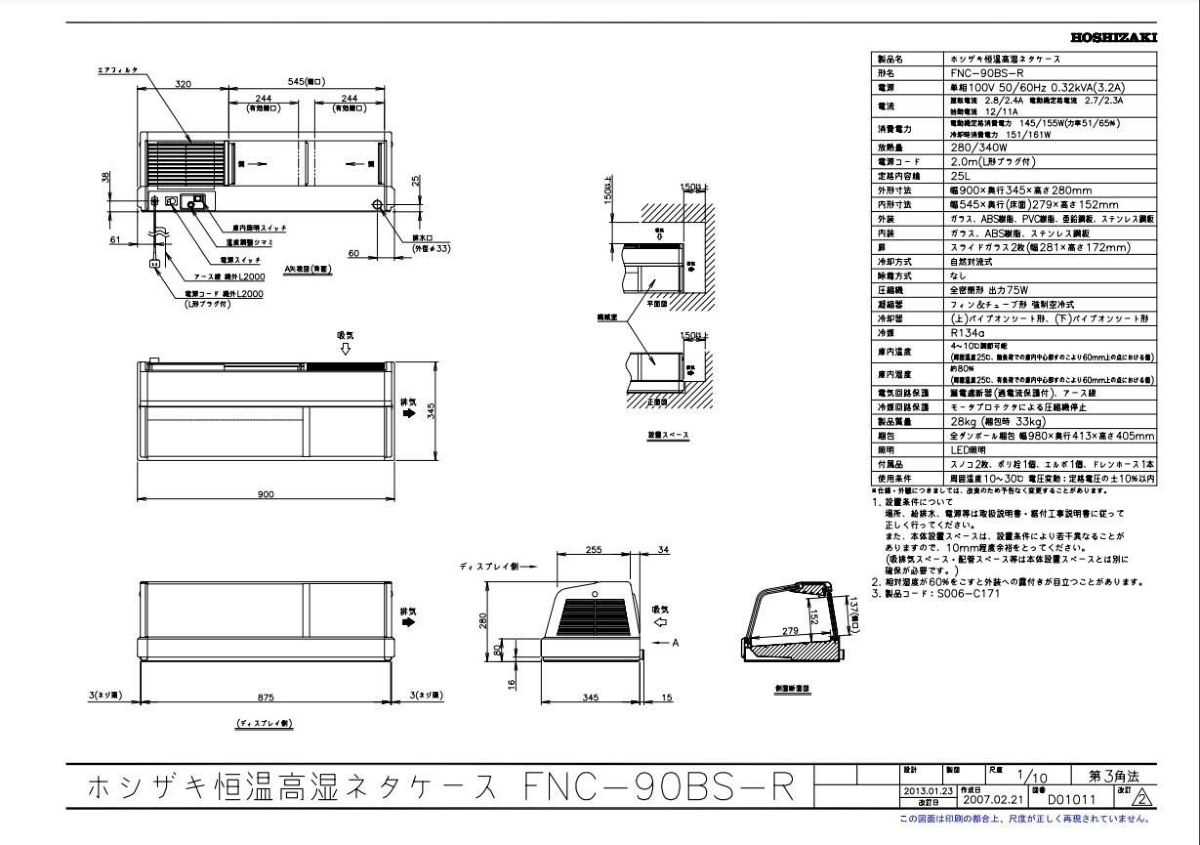 他の画像を見る 【業務用/新品】【ホシザキ】恒温高湿ネタケース FNC-90B-L 幅900×奥行345×高さ280(mm) 単相100V/送料無料 定価 ¥ 536,800 (税込)のところ 販売価格 ¥ 250,240 税込 詳細を見る