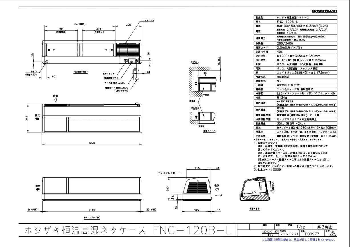 商品名:恒温高湿ネタケース FNC-120B-L 幅1200×奥行345×高さ280(mm) 単相100V