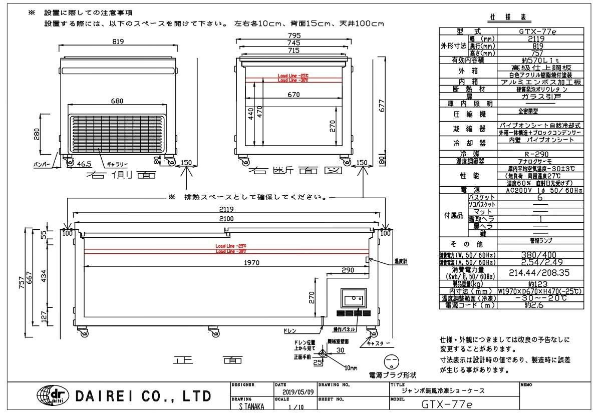 他の画像を見る ダイレイ GTXシリーズ ジャンボ無風冷凍ショーケース(GTX-77e)570L 幅2119×奥行819×高さ757(mm) キャスター付 【送料別途】【業務用】 キャスター付 /テンポス 定価 ¥ 825,000 (税込)のところ 販売価格 ¥ 497,991 税込 詳細を見る