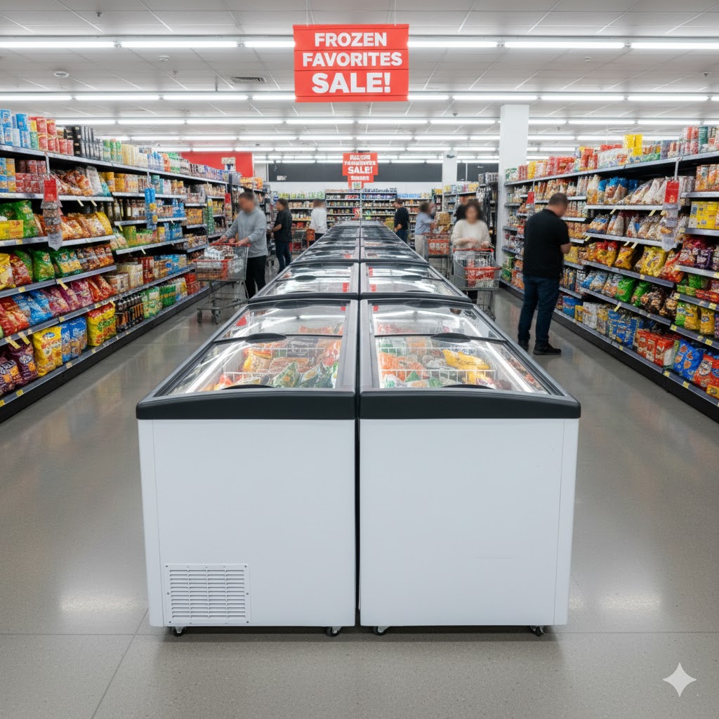 セルフ販売に最適な冷凍ケース。取り出しやすさと視認性を兼ね備え、大量陳列や特売・フェア展開にもおすすめです。