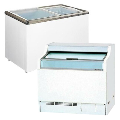 上部扉がスライド式もしくはスイング式になっている、いわゆる「冷凍ストッカータイプ」のショーケースです。 扉を閉めておくことで冷気が逃げにくく、電気代も抑えられます。 小型モデルから大容量タイプまで豊富なラインナップがあり、バックヤードでの食材保管にも最適です。
