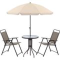 耐荷重(テーブル天板):10kg□テーブル[■甲板の表面材:ガラス(波形ガラス) ■構造部材:金属(鋼) ■表面加工:エポキシ樹脂塗装] □チェアー[■構造部材:金属(鋼) ■表面加工:エポキシ樹脂塗装 ■張り材:テキストレイン(PVC75%/ポリエステル25%)] □パラソル[■構造部材:金属(鋼) ■表面加工:エポキシ樹脂塗装 ■張り材:ポリエステル]