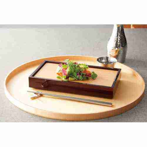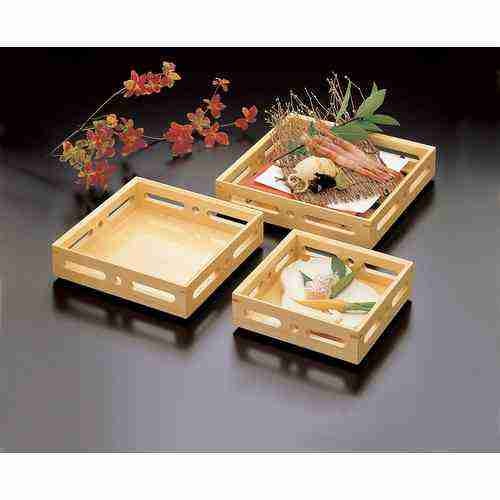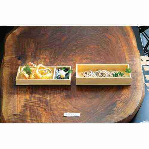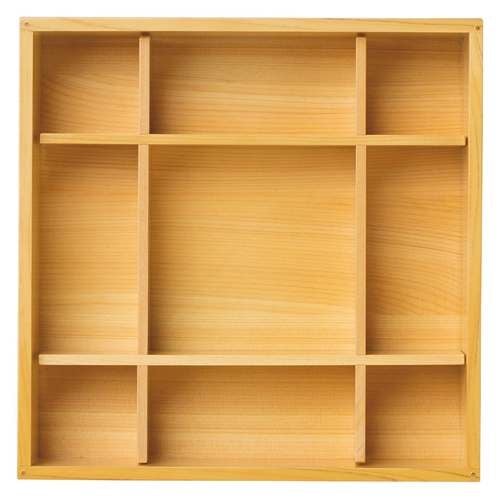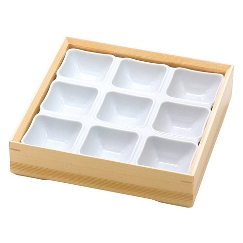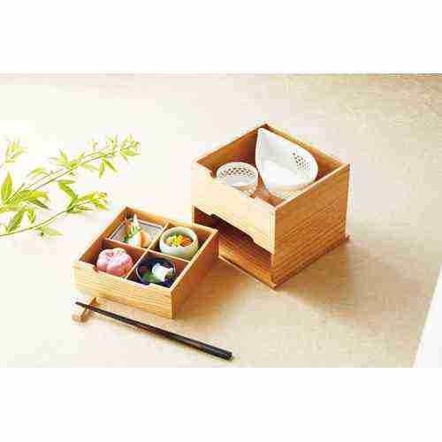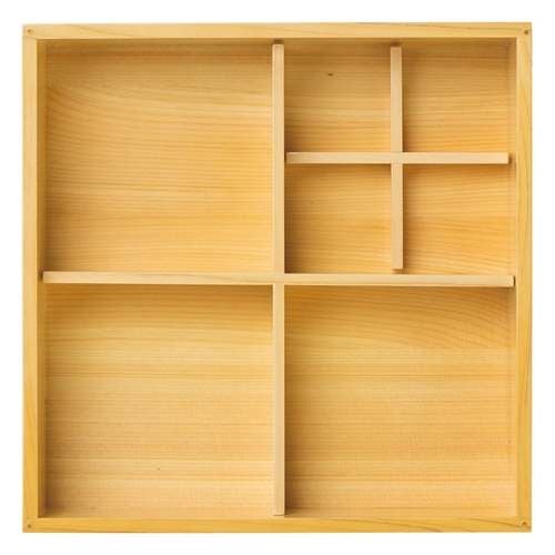 近年では、六ツ切仕切や九ツ仕切も珍しくはなく、松花堂用サイズの和食器を入れて組み合わせて使います。