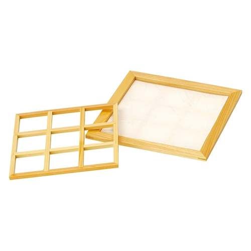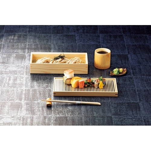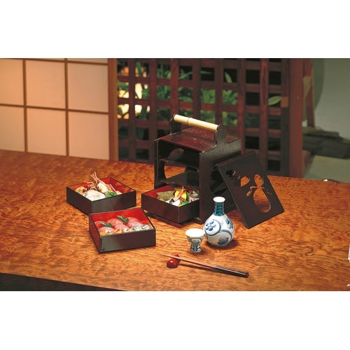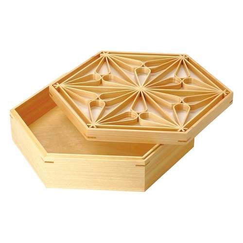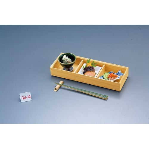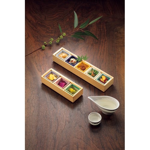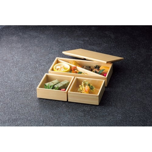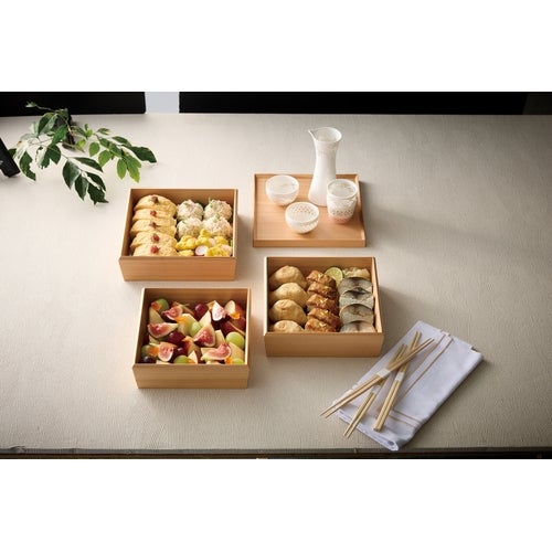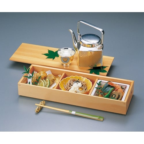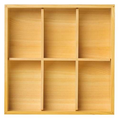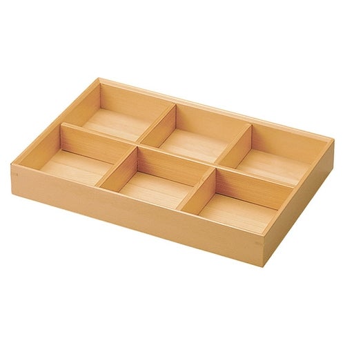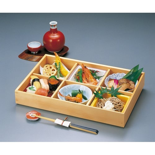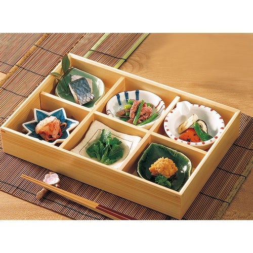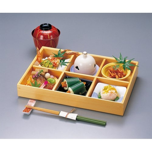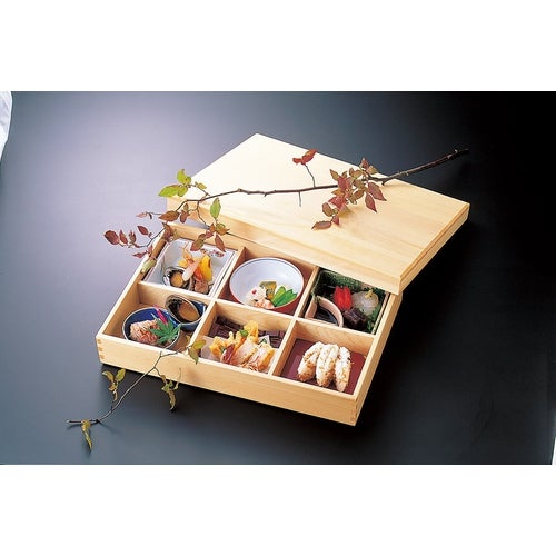 近年では、六ツ切仕切や九ツ仕切も珍しくはなく、松花堂用サイズの和食器を入れて組み合わせて使います。