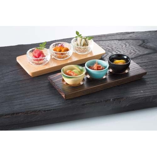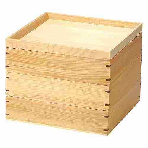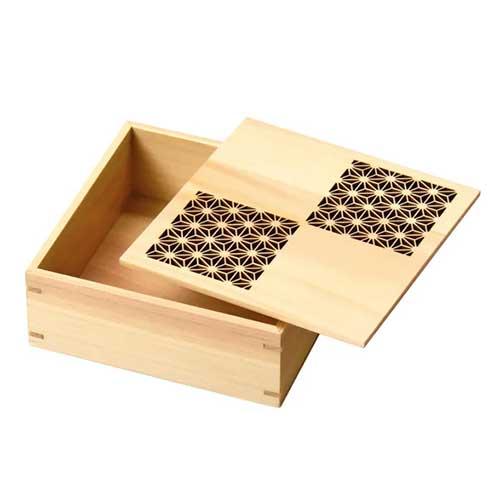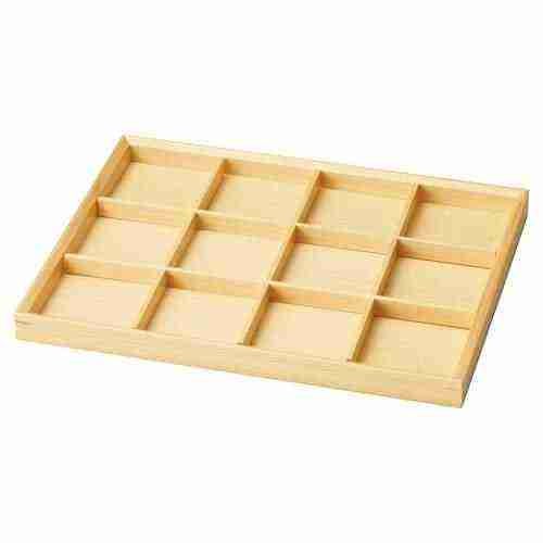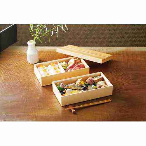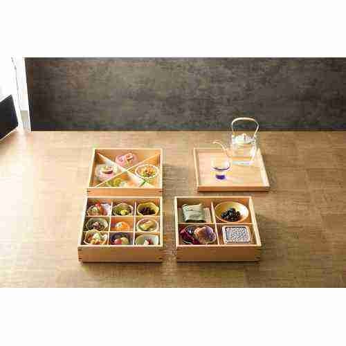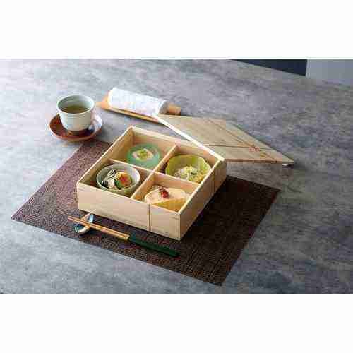 近年では、六ツ切仕切や九ツ仕切も珍しくはなく、松花堂用サイズの和食器を入れて組み合わせて使います。