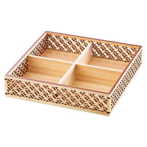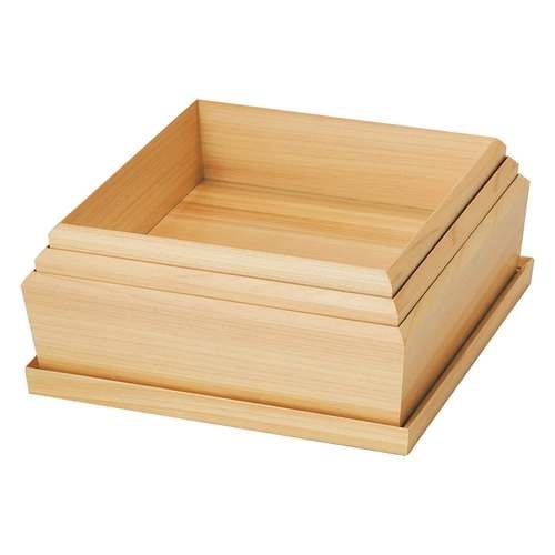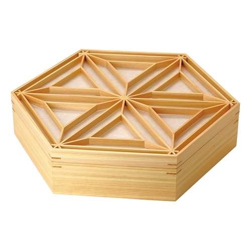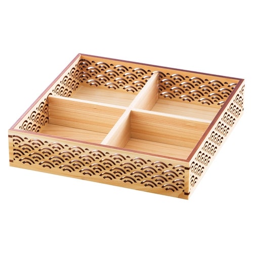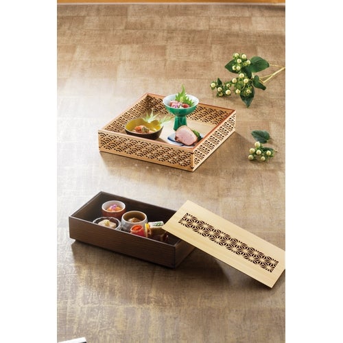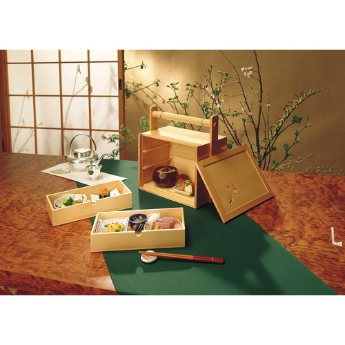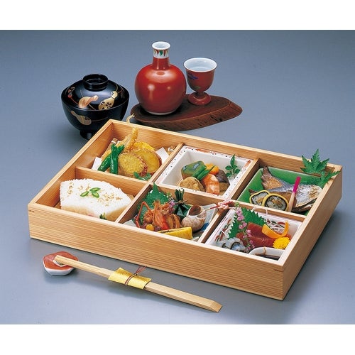 近年では、六ツ切仕切や九ツ仕切も珍しくはなく、松花堂用サイズの和食器を入れて組み合わせて使います。