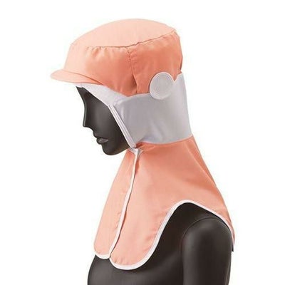 本体は接触冷感素材、額にパイル素材を使用し、落髪・ズレ防止と汗止め効果があります。頬・首部分は吸汗・速乾ニット素材。ツバとマスク掛けは織芯で洗濯可能、立体ケープで肩の負担を軽減。メガネ差しを装備しています。前留めはマジックテープ、後頭周りにはゴム入りです。交差汚染に対応した、ホワイト、サックス、グリーン、ピンク、イエローの5色展開です。