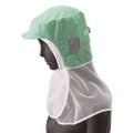 本体は接触冷感素材、ツバは洗濯耐久性の高い織芯を使用。額と頬はパイル素材、落髪・ズレ防止と汗止めの効果あり。耳部とケープは通気性の優れたメッシュ。前部留め、後頭周りはマジックテープでサイズ調整可能です。交差汚染に対応した、ホワイト、サックス、グリーンの3色展開です。