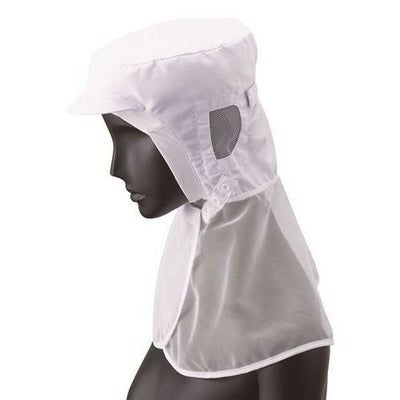 本体は接触冷感素材、ツバは洗濯耐久性の高い織芯を使用。額は吸汗速乾ニットで落髪・ズレ防止と汗止めの効果があります。ケープ素材はメッシュ。前留めは生地を傷めないスナップボタン、後ろ頭周りはマジックテープで調整可能です。