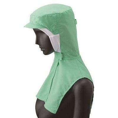本体は接触冷感素材で、額、頬にぴったりフィットする吸汗速乾ニット。ツバ芯は洗濯に強いポリエステル製「織芯」、ケープは肩に優しい立体パターン。メガネ差しは着用時の隙間のできないタイプです。前部留めはスナップボタン、後頭周りはマジックテープで調節可能です。交差汚染に対応した、ホワイト、サックス、グリーン、ピンクの4色展開です。