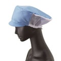 本体は接触冷感素材、ツバは小さめなので視界が良く、洗濯耐久性の高い織芯を使用したタイプ。額は快適な着用感と異物の出ない二重仕様。後方は通気性の良いメッシュ、サイズ調整範囲の大きい引き出しゴム式。交差汚染に対応した、ホワイト、サックス、グリーンの3色展開です。