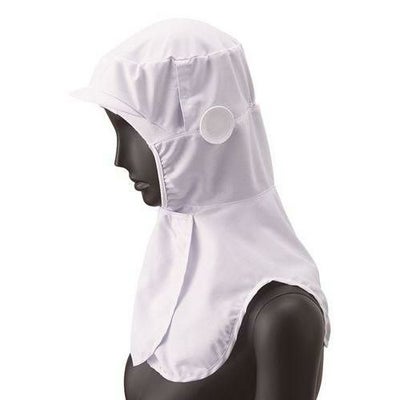 本体は接触冷感素材、ツバとマスク掛けは洗濯耐久性の高い織芯を使用。額と頬はパイル素材で落髪・ズレ防止と汗止めの効果を発揮します。立体ケープで肩の負担を軽減し、動きやすさを考慮。メガネ差しとマスク掛けを装備しています。前部留めはマジックテープ、後頭周りはゴム入りです。交差汚染に対応した、ホワイト、サックス、グリーンの3色展開です。