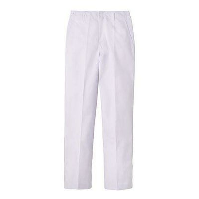 異物混入対策仕様のスタンダードの常温作業向けストレートパンツ。前開き金属ファスナー、両脇スラッシュ、右後片玉縁ポケット。インナー裾口ゴム入り、ホワイト、サックス、グリーンの3色展開です。(サックス、グリーンは価格が異なります。)