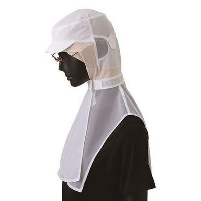 本体は涼感素材「シャミラン(R)」。ツバは耐洗濯性の高い織芯。顔周りはベージュのニット素材で異物落下防止と汗止めの効果、素材は肌に優しい吸汗速乾のテクノファイン(R)。ベージュにすることでファンデーションの付着も目立ちません。立体ケープは快適なメッシュ素材。前合わせはスナップ調整式、後頭周りには幅広ゴム入り。マスク掛けとはさみ込み式メガネ差しを採用。