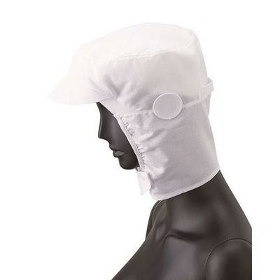 着用時の暑さを軽減する綿素材のショートフード。額はパイル素材で落髪・ズレ防止と汗止めの効果。ツバとマスク掛けは洗濯に耐える織芯を採用。前部留め、後頭周りはマジックテープで調整可能、マスクは円掛け式です。