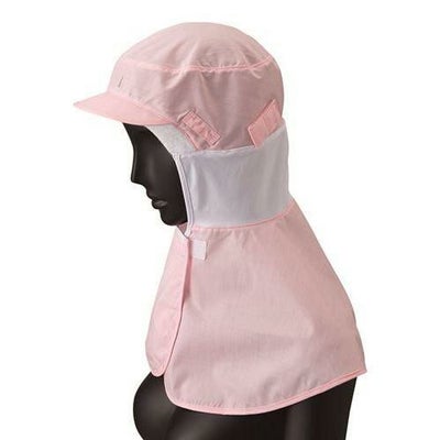 ツバは耐洗濯性の高い織芯、額はパイル素材で落髪・ズレを防止、汗止めの効果があります。頬・首部分はストレッチ素材。前部の留めはマジックテープで調整可能。メガネ差しはスリット式、後頭周り調整はゴム入りです。マスクはタブ掛け式、前頭部にネームプレート用力布付き。交差汚染に対応したホワイト、サックス、ピンク、グリーンの4色展開です。