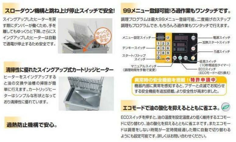 他の画像を見る 5メニューメモリーで各種の揚げ物温度をワンタッチ操作 SEFD-23K 電気フライヤー 23L(スタンドタイプ) 幅550×奥行600×高さ800(mm) 【業務用/新品】【送料無料】 定価 ¥ 613,800 (税込)のところ 販売価格 ¥ 361,768 税込 詳細を見る