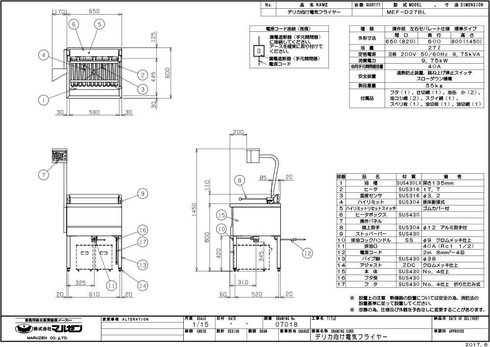 他の画像を見る デリカ向け電気フライヤー<オートリフト無しタイプ> MEF-D27B 【マルゼン】 電気フライヤー デリカ向け 三相200V 幅650×奥行600×高さ800(mm) 【業務用/新品】【送料無料】 定価 ¥ 830,500 (税込)のところ 販売価格 ¥ 473,961 税込 詳細を見る