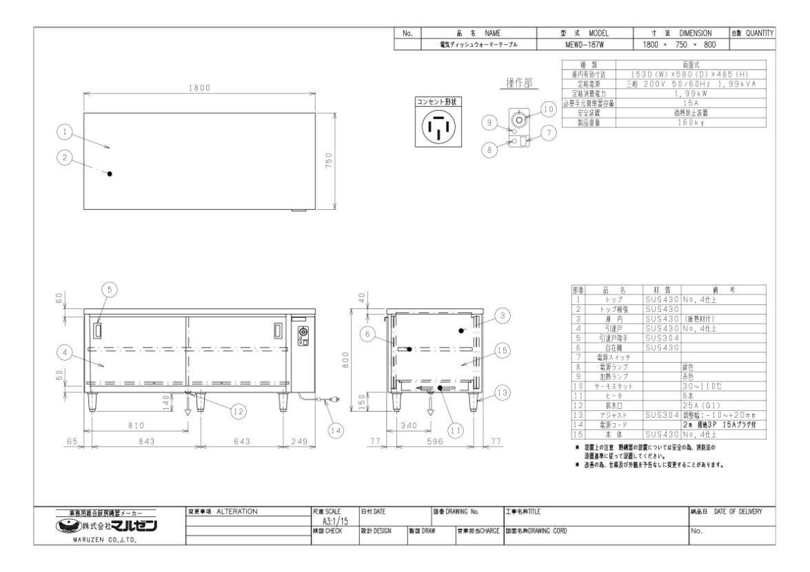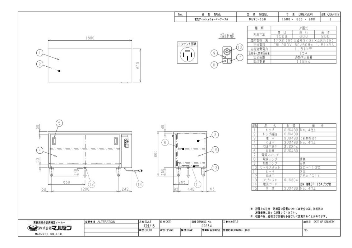 他の画像を見る 【業務用/新品】【マルゼン】電気ディッシュウォーマーテーブル 片面式 MEWD-156 幅1500×奥行600×高さ800mm【送料無料】 定価 ¥ 449,900 (税込)のところ 販売価格 ¥ 258,680 税込 詳細を見る