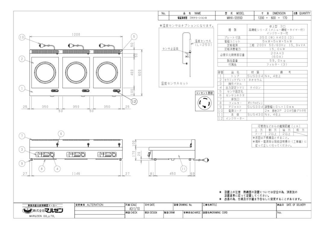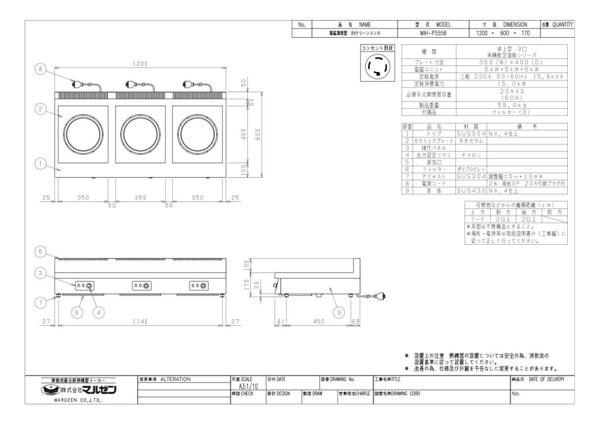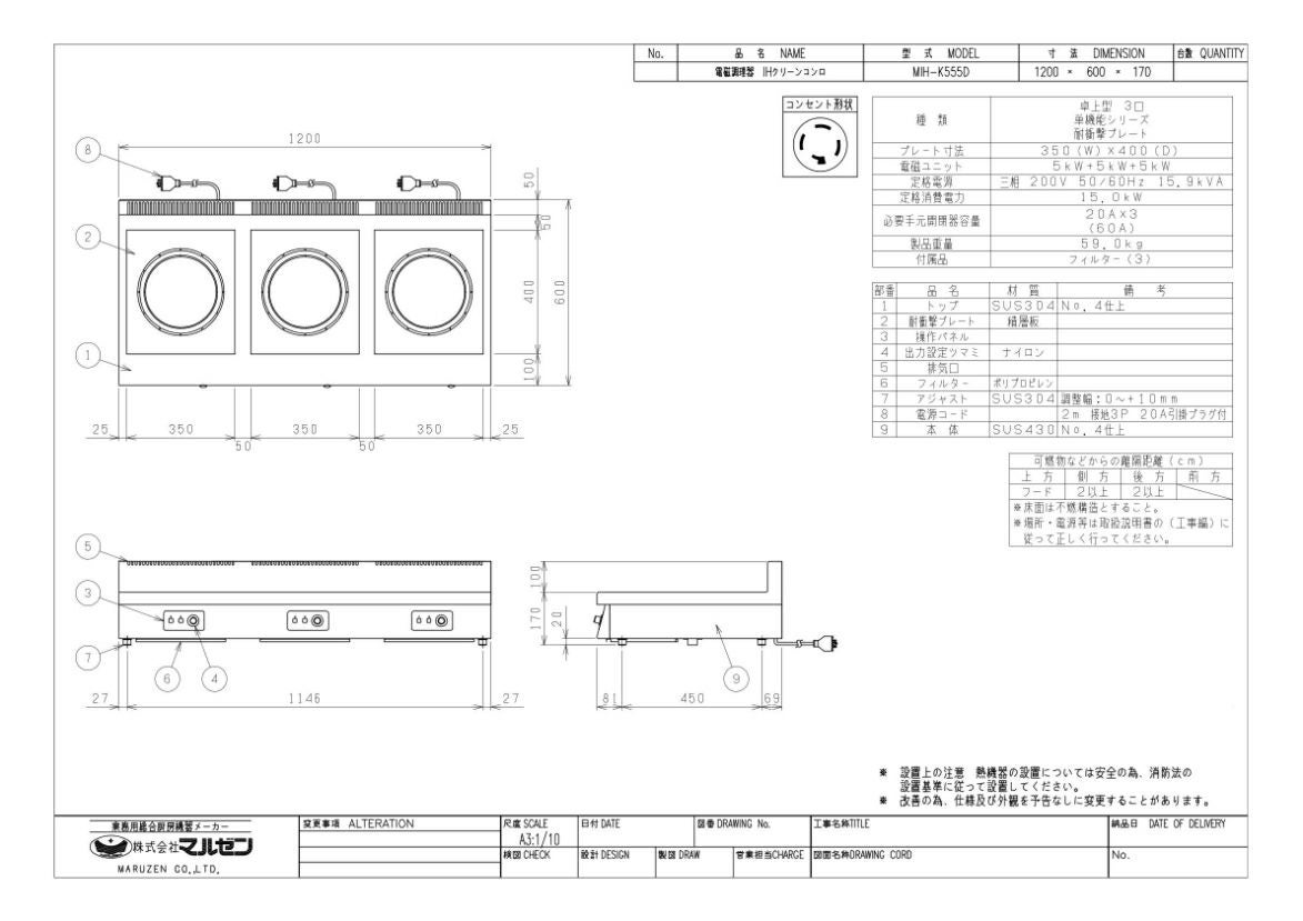 他の画像を見る MIH-555D 【マルゼン】IHクリーンコンロ 幅1200×奥行600×高さ170(mm) 三相200V【業務用/新品】【送料無料】 定価 ¥ 1,199,000 (税込)のところ 販売価格 ¥ 654,632 税込 詳細を見る