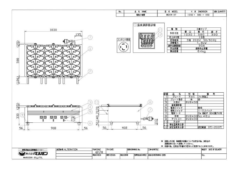 他の画像を見る 【業務用/新品】【マルゼン】電気たい焼器 MEKN-3T 幅1030×奥行580×高さ330(mm) 三相200V 50/60Hz【送料無料】 定価 ¥ 1,298,000 (税込)のところ 販売価格 ¥ 776,191 税込 詳細を見る