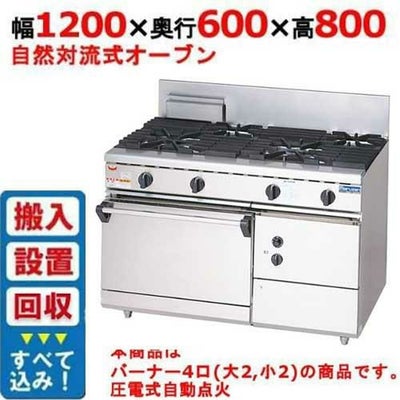 | 商品名 | ガスレンジ 4口 自然対流式オーブン W1200×D600×H800 | | 型番 | RGR-1264D (旧型式RGR-1264C) | | メーカー | マルゼン | | 外形寸法 | W1200×D600×H800(mm) バックガード高さ200mm |