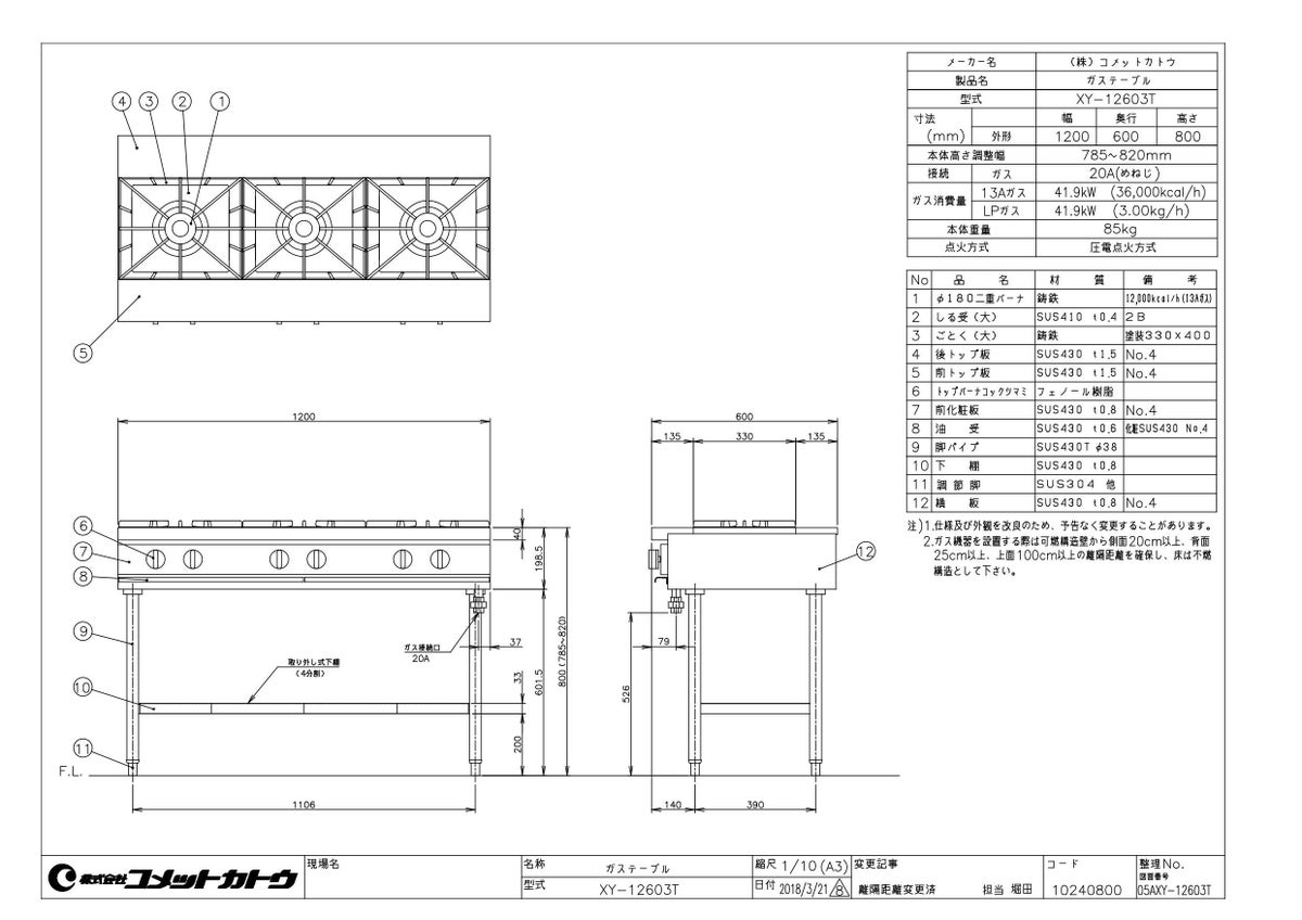 他の画像を見る 【業務用/新品】【コメットカトウ】ガステーブル 6口 XY-18126T 幅1800×奥行1200×高さ850(mm)【送料無料】 定価 ¥ 809,600 (税込)のところ 販売価格 ¥ 428,097 税込 詳細を見る