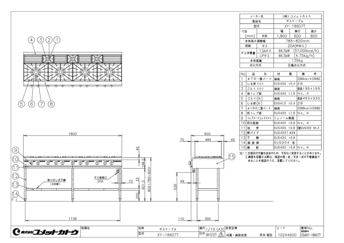 他の画像を見る 【業務用/新品】【コメットカトウ】ガステーブル 7口 XY-18757T 幅1800×奥行750×高さ800mm(mm)【送料無料】 定価 ¥ 595,100 (税込)のところ 販売価格 ¥ 302,231 税込 詳細を見る