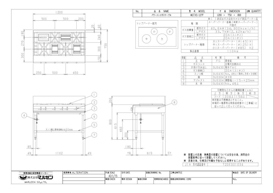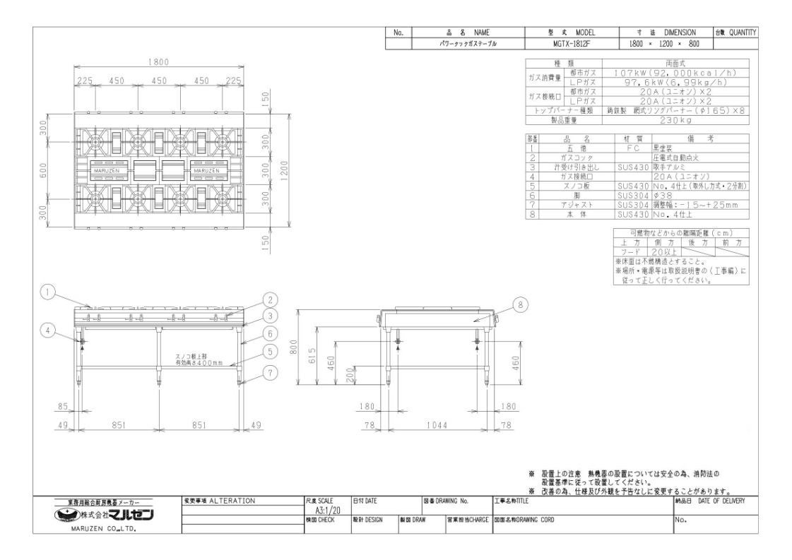 他の画像を見る 【業務用/新品】【マルゼン】ガステーブル 8口 パワークック MGTX-1812F(旧型式:MGTX-1812E)幅1800×奥行1200×高さ800(mm)【送料無料】 定価 ¥ 795,300 (税込)のところ 販売価格 ¥ 442,760 税込 詳細を見る