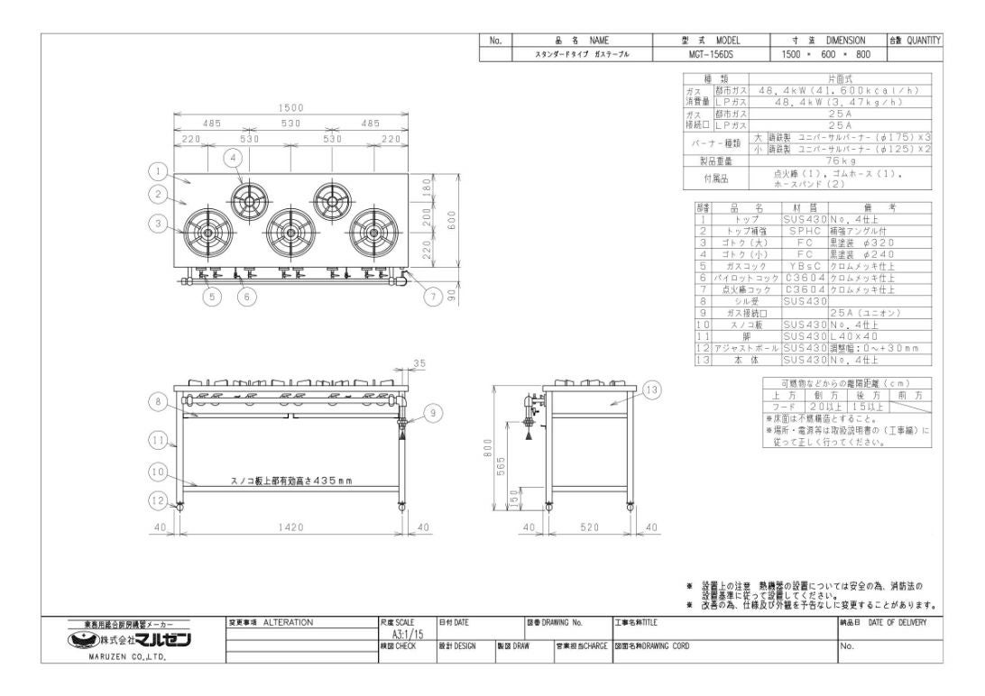 他の画像を見る 【業務用/新品】【マルゼン】ガステーブル 5口 スタンダードタイプ MGT-156DS 幅1500×奥行600×高さ800(mm)【送料無料】 定価 ¥ 247,500 (税込)のところ 販売価格 ¥ 115,962 税込 詳細を見る