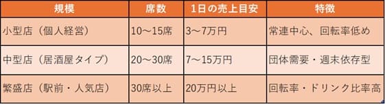 ここでは、個人経営の小型店から繁盛店まで、規模別に“リアルな目安”を整理してみましょう。