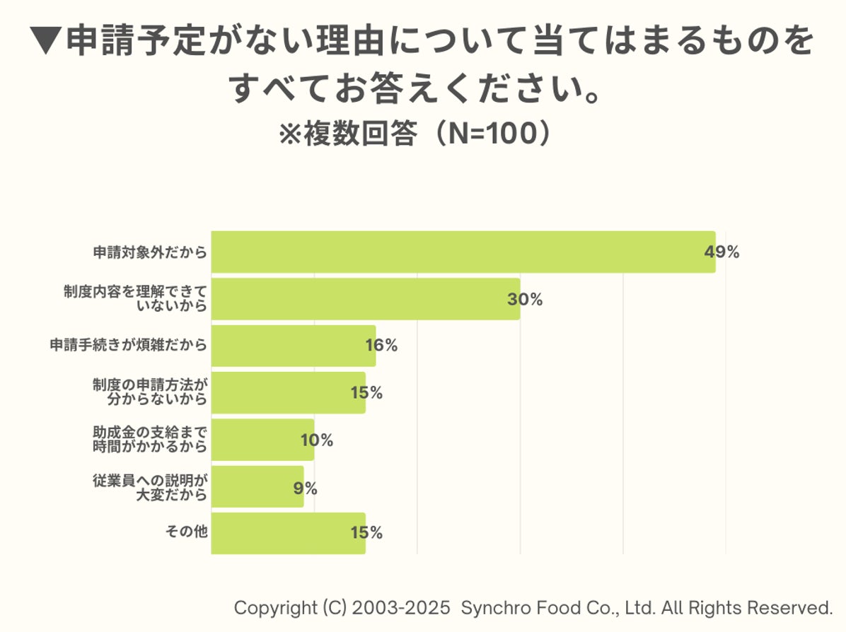 その上で「支援申請する予定はない」と回答した店舗にその理由を聞いたところ、最も多かった回答は「申請対象外だから(49.0%)」でおよそ半数以上。次に「制度内容を理解できていないから(30.0%)」、「申請手続きが煩雑だから(16.0%)」、「制度の申請方法が分からないから(15.0%)」という結果になりました。