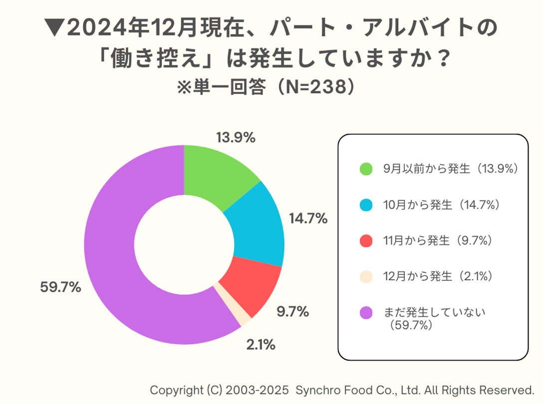 次に、アンケート調査を実施した2024年12月時点で「年収の壁」の影響によるパート・アルバイトスタッフの「働き控え」が発生しているか聞いたところ、最も多かったのは「まだ発生していない」で、59.7%。一方で「発生している」との回答も40.4%にのぼり、全体の28.6%が「10月までに発生している」という結果になりました。