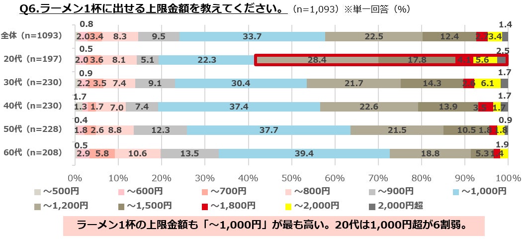 ・ラーメン1杯の上限金額も「~1,000円」が3人に1人と最も高いが、1,000円超と回答した人は4割強。20代は1,000円超が6割弱で、若い年代ほど上限金額は上がる傾向有り。