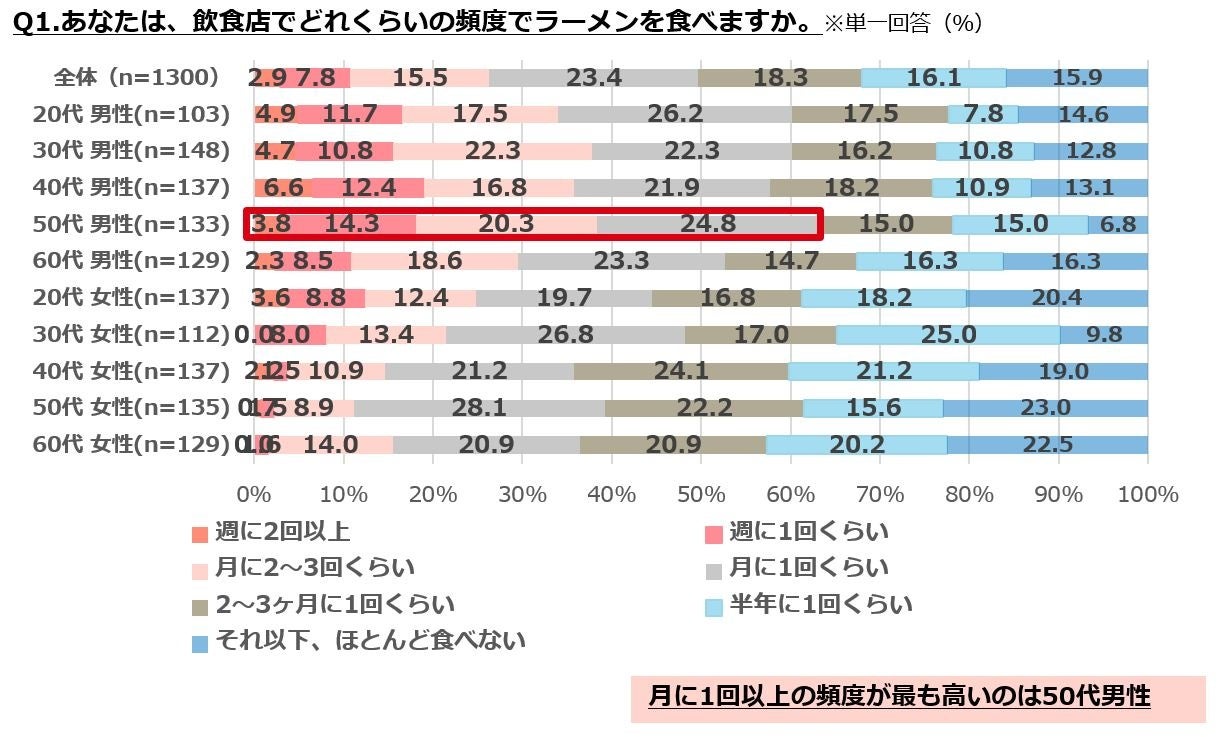 ・飲食店でラーメンを食べる頻度は「月に1回くらい」が23%、「2~3ヶ月に1回くらい」が18%で、月に1回以上の頻度が最も高いのは50代男性。