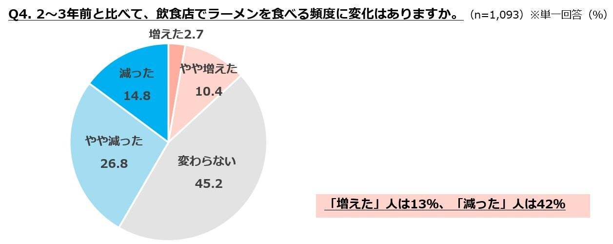 ・2~3年前と比べたラーメンを食べる頻度は、増えた人の13%に対して減った人は42%と大きく上回るが、20代では両者が同率となる。