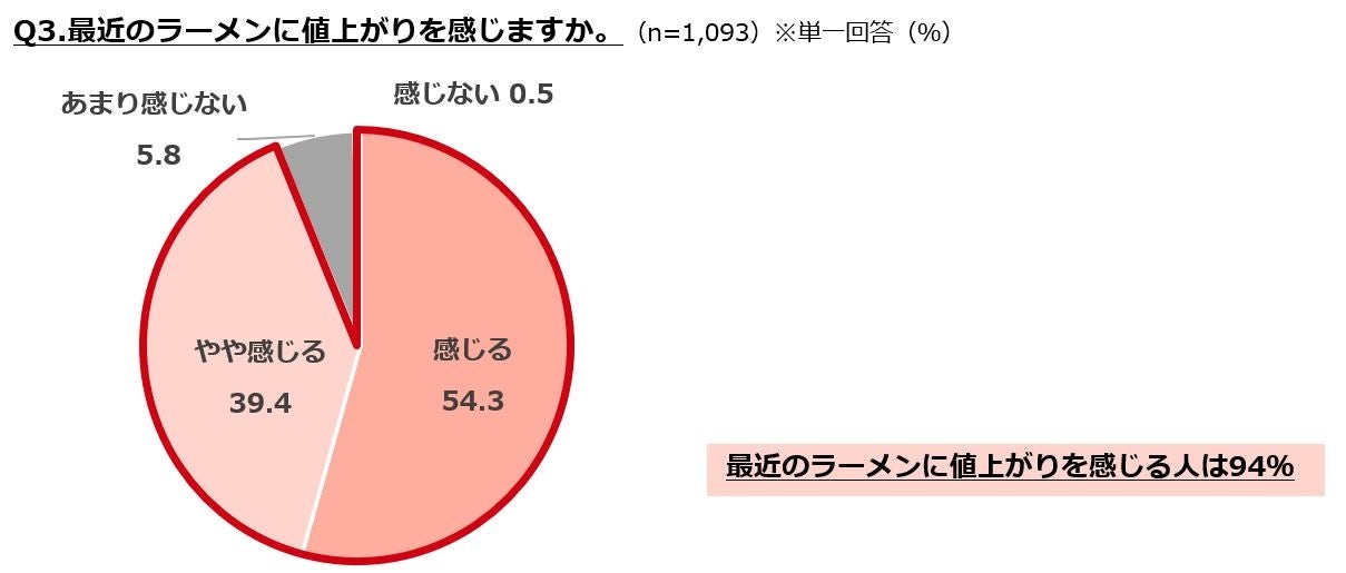 ・最近のラーメンに値上がりを感じる人は94%で、20代は9割未満とやや低い。