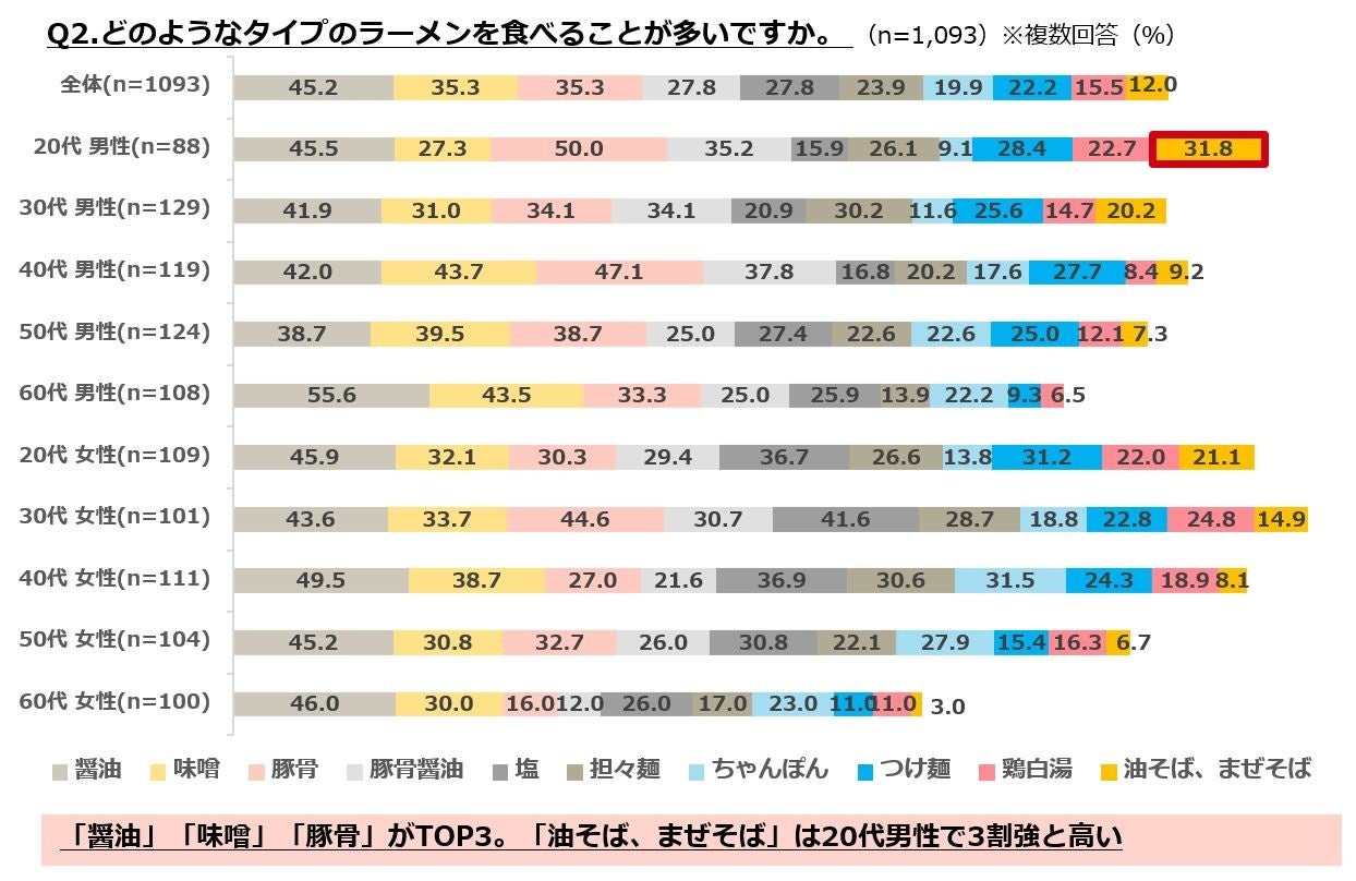 ・食べることの多いラーメンのタイプは「醤油」「味噌」「豚骨」がTOP3。「塩」は男女で10pt以上の差有り。「油そば、まぜそば」は20代男性で3割強と高い。