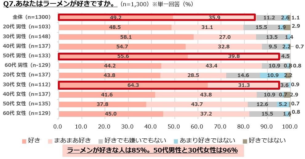 ・ラーメンが好きな人は85%で、50代男性と30代女性では96%と高い。