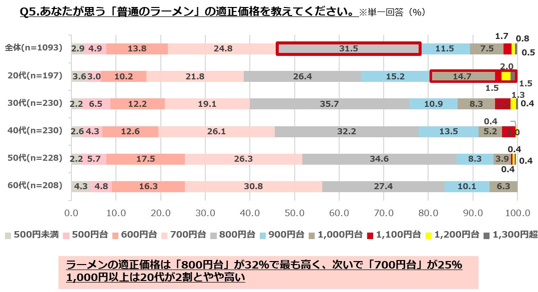 ・普通のラーメンの適正価格は「800円台」が32%で最も高く、次いで「700円台」が25%で、全体の9割が1,000円未満と回答。1,000円以上は20代が2割とやや高い。