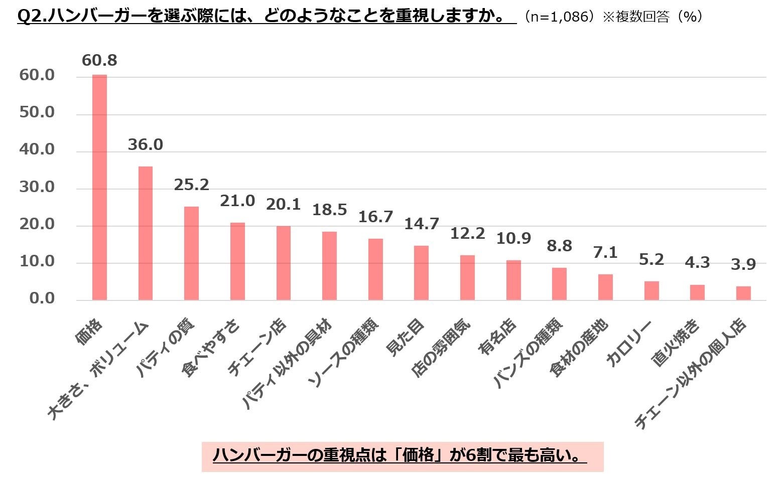 ・ハンバーガーの重視点は「価格」が6割で最も高く、次いで「大きさ、ボリューム」。