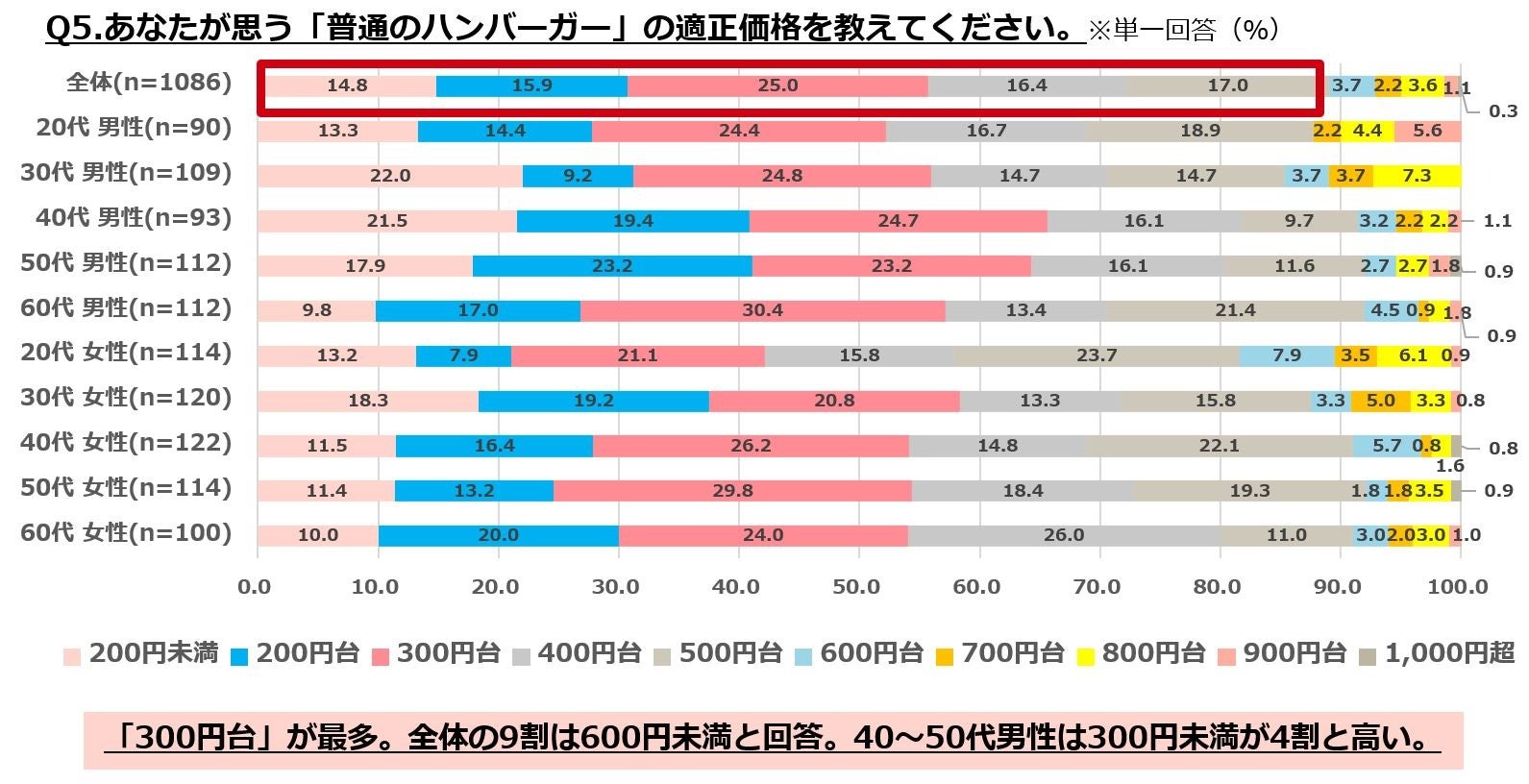 ・普通のハンバーガーの適正価格は「300円台」が4人に1人で最多となり、全体の9割は600円未満と回答。40~50代男性は300円未満が4割と高い。