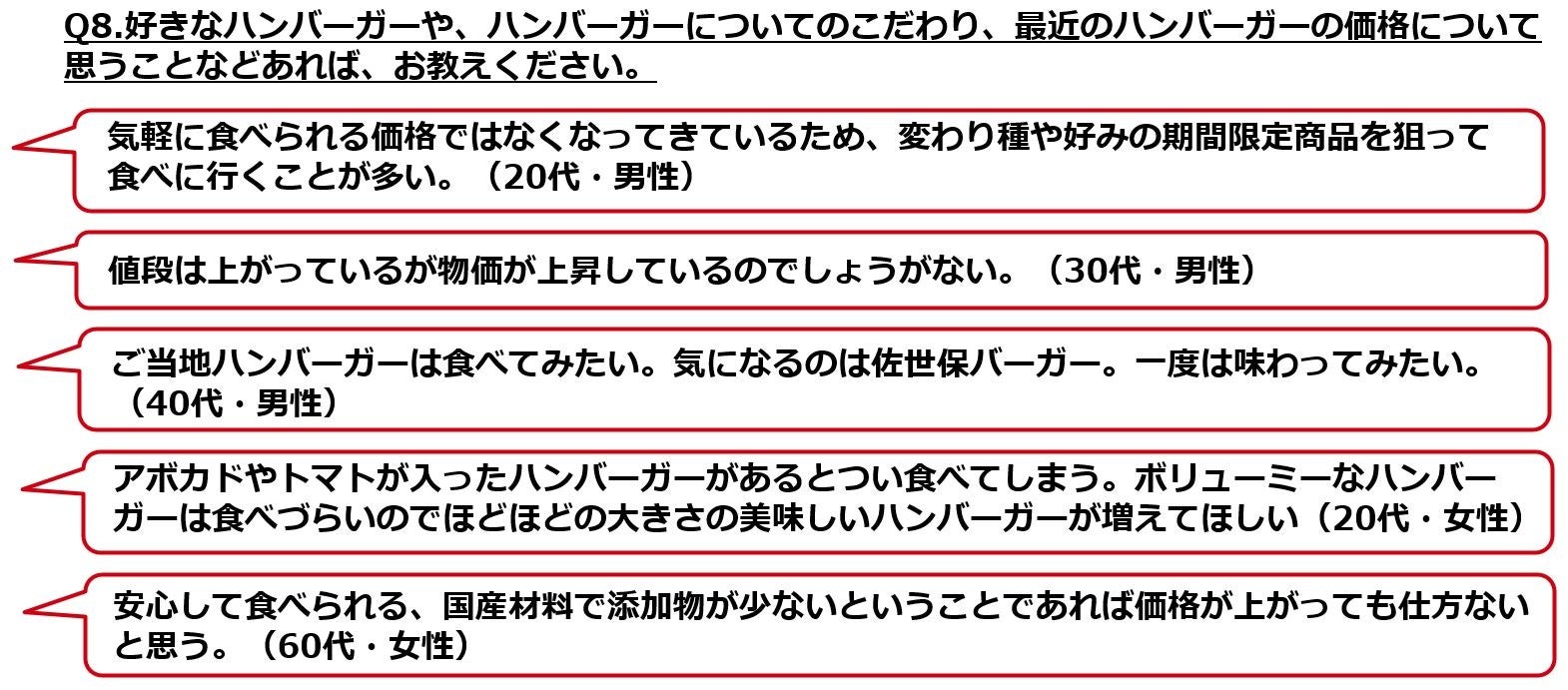 また、自由回答では、価格を考慮しながら食べたいハンバーガーを狙って食べに行く様子や、上がる価格を許容する様子、好きなハンバーガーについつい手が出てしまう様子などがみられ、高まる価格意識と、高まるハンバーガーの価格と、ハンバーガーの好き度のバランスを取りながらハンバーガーを楽しんでいることがわかりました。
